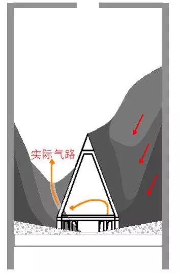 然而,人們都忽視了庫(kù)內(nèi)粉體分層重力拱產(chǎn)生的料重外擴(kuò)集膚疊加效應(yīng),實(shí)際上庫(kù)內(nèi)密度分布是外壁硬內(nèi)空軟,偏偏低密度的外加空氣必然走軟不走硬,因此注定了整個(gè)系統(tǒng)處于偏移發(fā)散性力學(xué)傳導(dǎo)模式,如圖3所示。