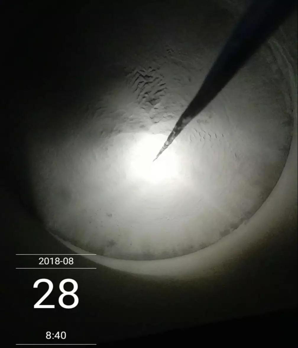 該系統(tǒng)成功應(yīng)用了近一年,充分經(jīng)歷了用戶針對(duì)性的各種極端工況測(cè)試,徹底證明了粉流掣的理論正確性和強(qiáng)大的自適應(yīng)實(shí)用性,每次徹底放空均能保證太極錐露出錐頂,只余自然堆積的少量可循環(huán)尾料,如圖8所示。