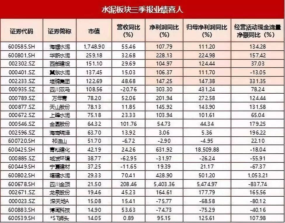 數(shù)據(jù)顯示,今年前三季度,水泥板塊共實(shí)現(xiàn)營(yíng)業(yè)收入1719.89億元,同比增長(zhǎng)33.45%;實(shí)現(xiàn)凈利潤(rùn)329.28億元,同比增長(zhǎng)115.61%。21家水泥行業(yè)上市公司中,17家今年前三季度凈利潤(rùn)同比實(shí)現(xiàn)增長(zhǎng),14家同比增長(zhǎng)超過(guò)100%。以水泥市值的前五家公司來(lái)看,海螺水泥、華新水泥、西部建設(shè)、冀東水泥、塔牌集團(tuán)的凈利潤(rùn)同比增速在三季度均超過(guò)100%。