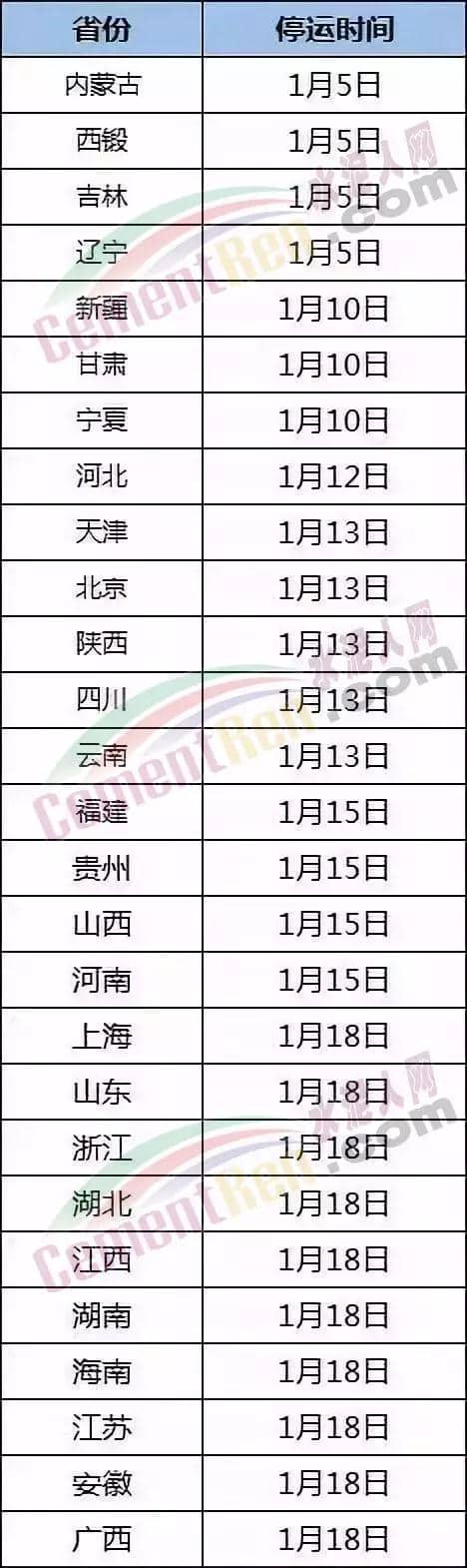 內(nèi)蒙古,西藏,吉林,遼寧等地1月5日停運(yùn),新疆,甘肅,寧夏等地1月10日停運(yùn)。河北1月12日停運(yùn),天津,北京,陜西,四川,云南等地1月13日停運(yùn)。福建,貴州,山西,河南等地1月15日停運(yùn)。上海,山東,浙江,湖北,江西,湖南,海南,江蘇,安徽,廣西等地1月18日停運(yùn)。