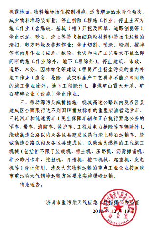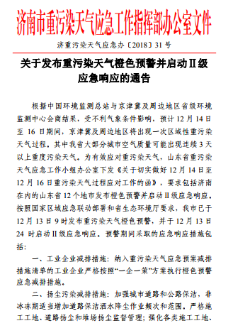 近日,濟南市發(fā)布重污染天氣應急工作指揮部辦公室文件 濟南重污染天氣應急辦{2018}31號,關(guān)于發(fā)布重污染天氣橙色預警并啟動Ⅱ級應急響應的通告。根據(jù)中國環(huán)境監(jiān)測總站與京津冀及周邊地區(qū)省級環(huán)境監(jiān)測中心會商結(jié)果,受不利氣象條件影響,預計12月14日至16日期間,京津冀及周邊地區(qū)將出現(xiàn)一次區(qū)域性重污染天氣過程。其中我省大部分城市空氣質(zhì)量可能出現(xiàn)連續(xù)出現(xiàn)3天以上重度污染天氣。為有效應對重污染天氣,山東省重污染天氣應急小組辦公室下發(fā)《關(guān)于切實做好12月14日至12月16日重污染天氣過程應對工作的函》