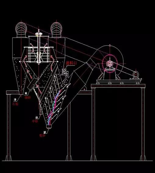 吉能達(dá)公司將V型選粉機和自主研發(fā)的三分離選粉機有機的結(jié)合,研制出復(fù)合式機制砂風(fēng)選脫粉機,該產(chǎn)品已獲得江蘇省科技廳高新技術(shù)產(chǎn)品認(rèn)定,被國家科技部列為機制砂風(fēng)選脫粉產(chǎn)業(yè)化創(chuàng)新項目。該產(chǎn)品利用V型選粉機將4.75~2.37mm的粗顆粒率先分離出來,粗顆??稍倩刂粕皺C繼續(xù)制砂,也可作為成品出售,中砂和細(xì)砂通過V后被上部的籠型轉(zhuǎn)子分離出來,0.075mm的細(xì)粉則被旋風(fēng)筒收集下來,從而實現(xiàn)脫粉的目的。