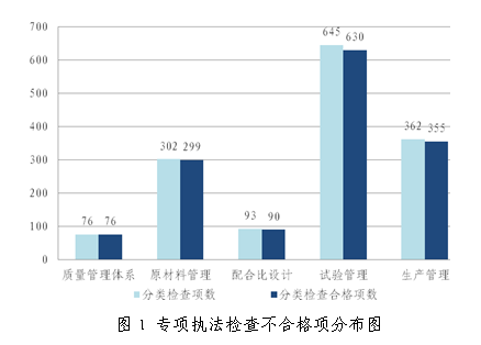 三季度專項執(zhí)法檢查內容包括:預拌混凝土企業(yè)的質量管理體系、原材料管理、配合比設計、試驗管理、生產管理等方面,共計檢查預拌混凝土企業(yè)34家次,1478項次,其中合格1450項,合格率為98.1%,不合格項主要出現在試驗管理方面,具體情況見圖1。在執(zhí)法檢查的同時對預拌混凝土試塊(拌合物)、原材料進行了抽檢,其中抽檢混凝土試塊(拌合物)115組,合格113組,合格率為98.3%,預拌混凝土出廠質量良好;抽檢原材料67組,全部合格??傮w來看,我市預拌混凝土質量整體穩(wěn)定可靠。