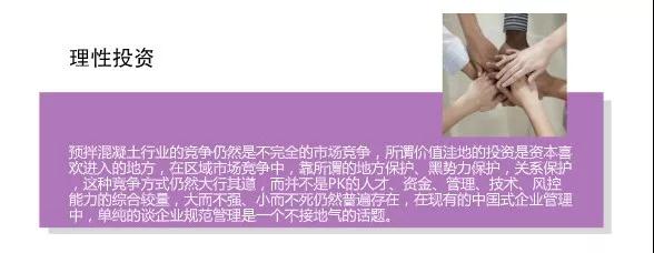 其一,預(yù)拌混凝土行業(yè)的利潤(rùn)仍然可觀,否則會(huì)出現(xiàn)資本的退出而非繼續(xù)進(jìn)入; 其二,預(yù)拌混凝土行業(yè)的競(jìng)爭(zhēng)仍然是不完全的市場(chǎng)競(jìng)爭(zhēng),所謂價(jià)值洼地的投資是資本喜歡進(jìn)入的地方,在區(qū)域市場(chǎng)競(jìng)爭(zhēng)中,靠所謂的地方保護(hù)、黑勢(shì)力保護(hù),關(guān)系保護(hù),這種競(jìng)爭(zhēng)方式仍然大行其道,而并不是PK的人才、資金、管理、技術(shù)、風(fēng)控能力的綜合較量,大而不強(qiáng)、小而不死仍然普遍存在,在現(xiàn)有的中國(guó)式企業(yè)管理中,單純的談企業(yè)規(guī)范管理是一個(gè)不接地氣的話題。