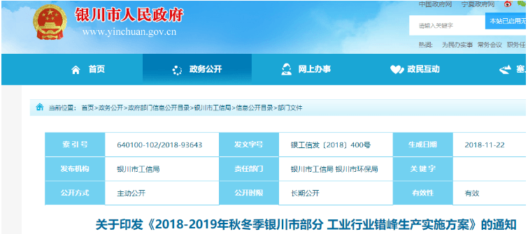 附原文:關(guān)于印發(fā)《2018-2019年秋冬季銀川市部分工業(yè)行業(yè)錯峰生產(chǎn)實施方案》的通知