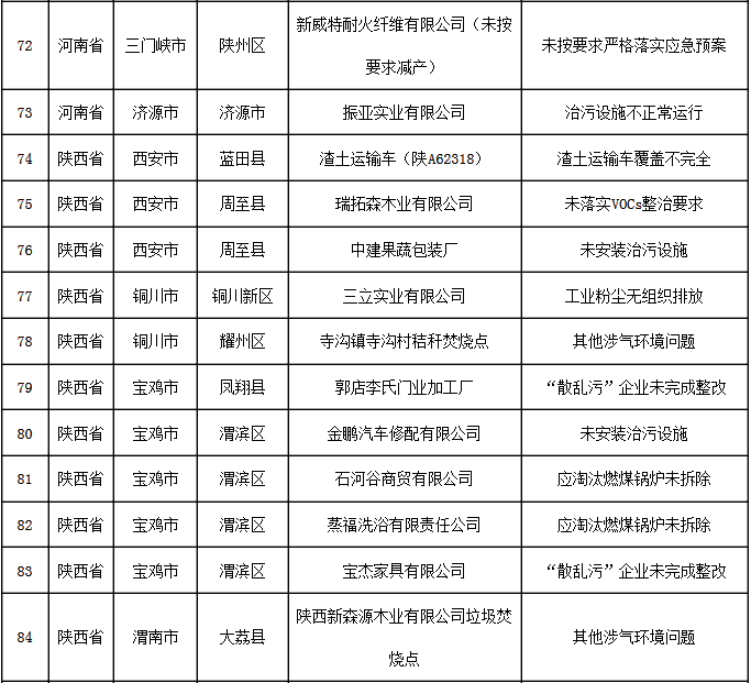 工作組發(fā)現,山西省運城河津市山西曙光船窩煤業(yè)有限公司河津百底焦化廠存在超標排放問題。河南省洛陽偃師市有1家(未設置排氣筒)企業(yè)廢氣排放口設置未達到環(huán)評要求。河北省石家莊辛集市河北德瑞淀粉有限公司存在異味,影響周邊環(huán)境。山西省長治市長治縣西火鎮(zhèn)下趙家村、長子縣飛達煤業(yè)旁,晉城市沁水縣嘉峰鎮(zhèn)郭南村;山東省濟寧市任城區(qū)安居鎮(zhèn)內景村;陜西省銅川市耀州區(qū)寺溝鎮(zhèn)寺溝村,渭南市大荔縣新森源木業(yè)有限公司存在露天焚燒現象。