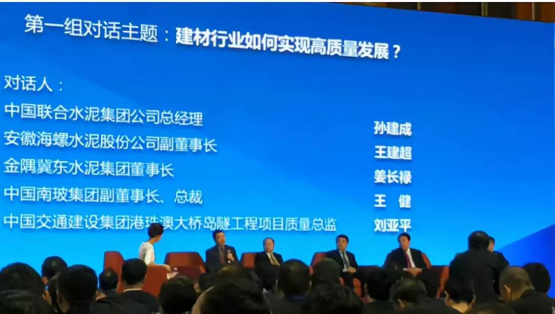 隨后,整個會議進行第一個議程,由中國聯(lián)合水泥集團公司總經理孫建成、安徽海螺水泥股份公司副董事長王建超、金隅冀東水泥集團董事長姜長祿、中國南玻集團副董事長、總裁王健、中國交通建設集團港珠澳大橋島隧工程項目質量總監(jiān)劉亞平就“如何實現(xiàn)建材行業(yè)高質量發(fā)展”展開激烈的討論。