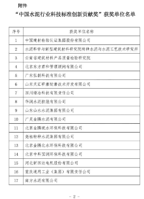 中國(guó)水泥協(xié)會(huì)為表彰中國(guó)水泥行業(yè)團(tuán)體標(biāo)準(zhǔn)創(chuàng)新和標(biāo)準(zhǔn)體系建設(shè)、科技創(chuàng)新和推廣工作中做出突出貢獻(xiàn)的單位,舉辦了“中國(guó)水泥行業(yè)科技標(biāo)準(zhǔn)創(chuàng)新貢獻(xiàn)獎(jiǎng)”評(píng)選活動(dòng),其中山東山水水泥,華潤(rùn)水泥控股,南方水泥、廣靈金隅水泥、堯柏特種水泥等16家單位被授予“中國(guó)水泥行業(yè)科技標(biāo)準(zhǔn)創(chuàng)新貢獻(xiàn)獎(jiǎng)”。