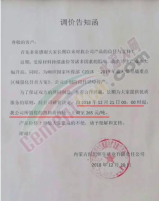 水泥人網(wǎng)信息中心消息,昨日(12月20日)內(nèi)蒙古世紀(jì)恒生礦業(yè)有限責(zé)任公司發(fā)布調(diào)價(jià)告知函,稱自今日起公司銷售的熟料價(jià)格上調(diào)至265元/噸。