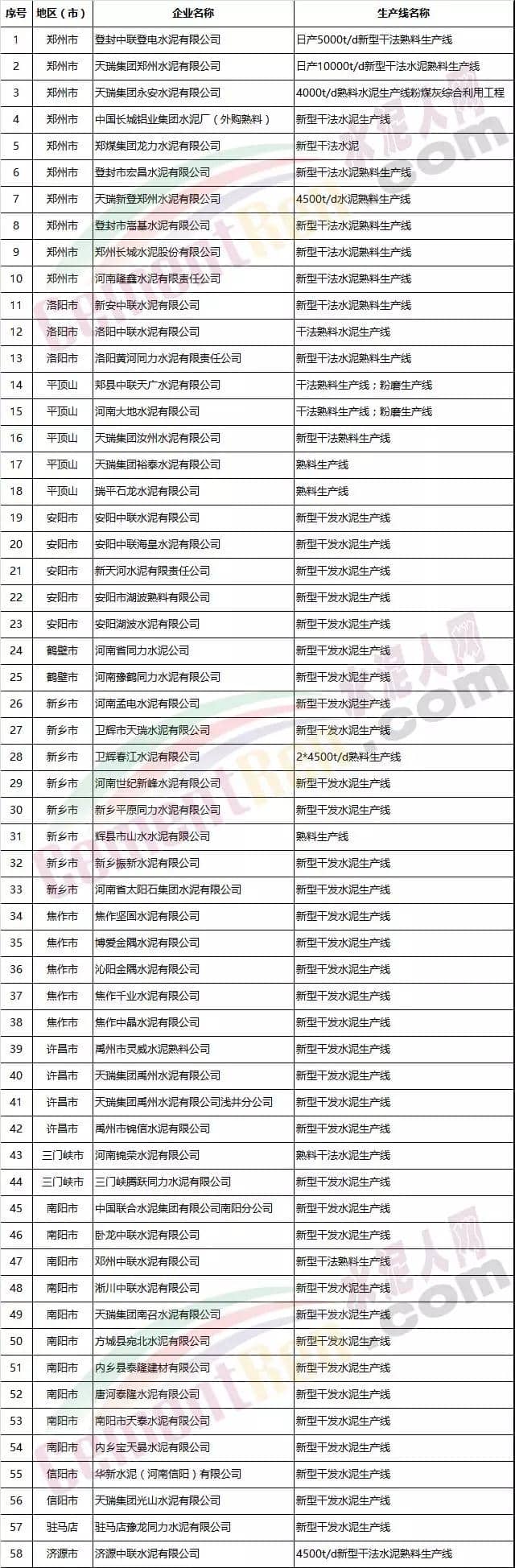 河南省部分水泥熟料生產(chǎn)企業(yè)名單