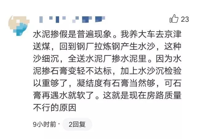 1、有網(wǎng)友說(shuō):水泥摻假是普遍現(xiàn)象。我養(yǎng)大車(chē)去京津送煤,回到鋼廠(chǎng)拉煉鋼產(chǎn)生水沙,這種沙細(xì)沉,全送水泥廠(chǎng)摻水泥里。因?yàn)樗鄵绞嘧冚p不達(dá)標(biāo),加上水沙沉檢驗(yàn)以重夠了,凝結(jié)度有石膏當(dāng)然夠,可石膏再遇水就軟了。這就是現(xiàn)在房路質(zhì)量不行的原因。