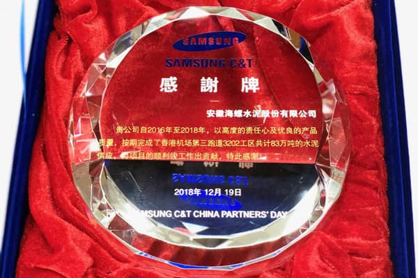 2018年12月19日上午,韓國(guó)三星物產(chǎn)公司在上海元一希爾頓酒店召開中國(guó)供應(yīng)商大會(huì),上海海螺國(guó)貿(mào)受邀參加了會(huì)議,會(huì)議授予海螺水泥“優(yōu)秀供應(yīng)商”稱號(hào),向海螺水泥在確保香港國(guó)際機(jī)場(chǎng)第三跑道DCM項(xiàng)目3202標(biāo)段順利竣工做出的卓越貢獻(xiàn)表示感謝。