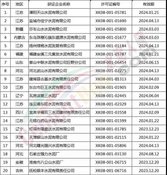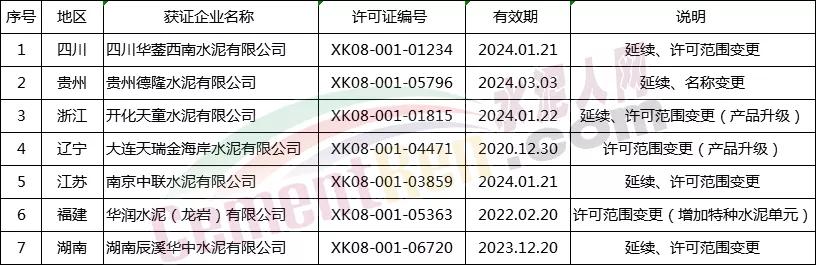 到期延續(xù)證書(shū)20個(gè)編號(hào),涉及華潤(rùn)水泥 、山水水泥、中聯(lián)水泥、天山水泥等企業(yè)集團(tuán)子公司;名稱變更、許可范圍變更的共7個(gè)編號(hào),其中包括四川華鎣西南水泥、南京中聯(lián)水泥、華潤(rùn)水泥龍巖公司等公司;