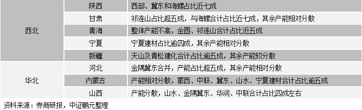 不同區(qū)域所包含省份市場集中度亦存在較大差異。華東地區(qū)江西、山東、安徽及浙江市場集中度較高,江蘇及福建市場相對分散,其中福建市場競爭激烈;東北地區(qū)吉林及黑龍江市場主要由亞泰集團和北方水泥主導(dǎo),遼寧市場集中度相對較低;中南地區(qū)湖北市場中華新水泥產(chǎn)能占比近四成,湖南水泥供應(yīng)主要來自海螺水泥、南方水泥及華新水泥,河南、廣東及廣西水泥產(chǎn)能相對分散;西北地區(qū)陜西和甘肅市場集中度高,寧夏建材在寧夏水泥市場控制力較強,新疆及青海市場集中度偏低;西南地區(qū)市場集中度均不高;華北地區(qū)金隅與冀東合并后河北水泥市場占有率逾五成,內(nèi)蒙古及山西市場集中度低,市場競爭激烈。