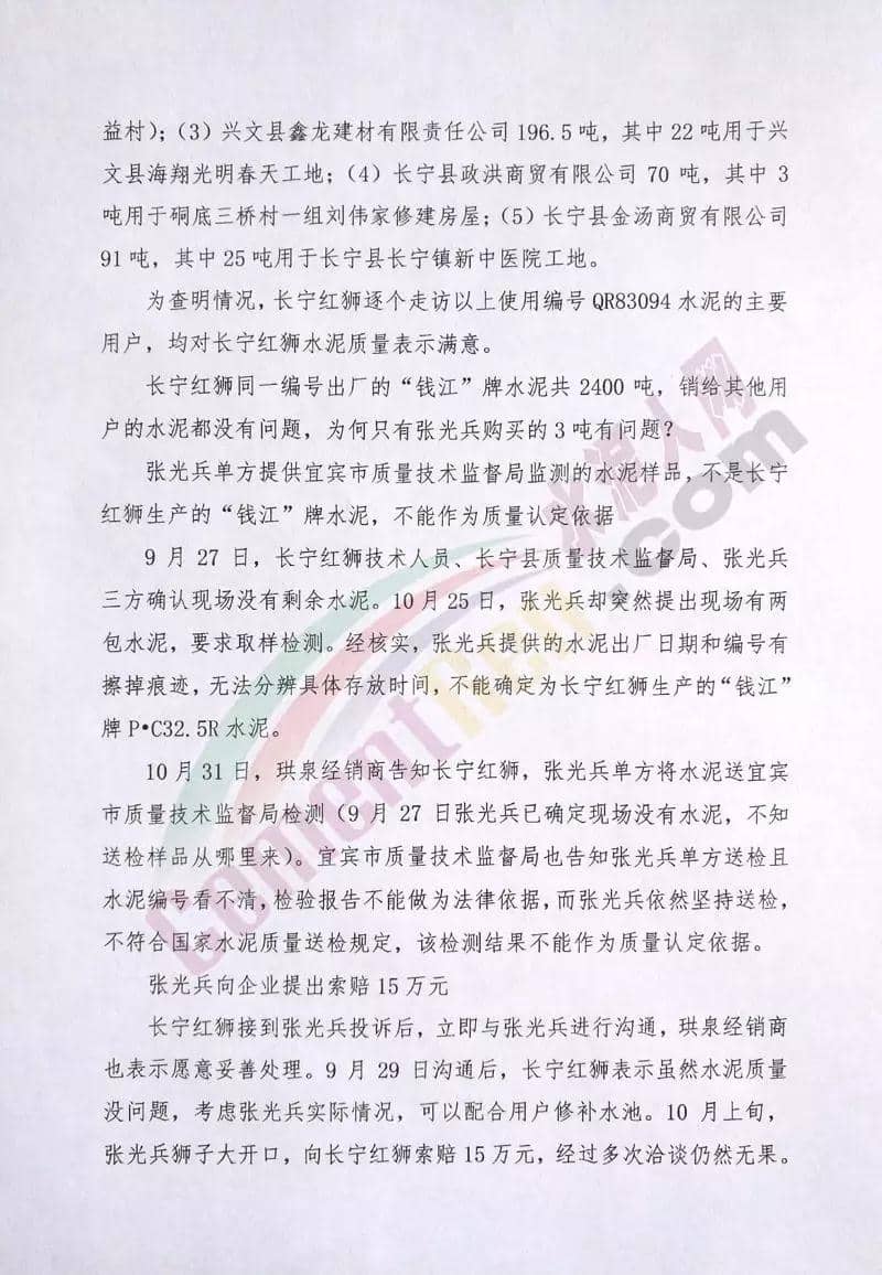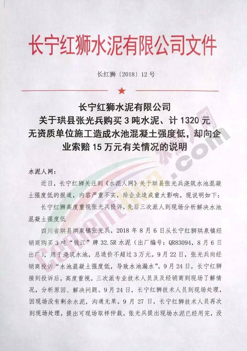 日前,位于四川省宜賓市長寧縣硐底鎮(zhèn)的長寧紅獅被質疑水泥質量不合格:珙縣居民張光兵在珙縣展鵬商貿有限責任公司購買了數(shù)噸紅獅水泥,用于修建水池,水池修好后出現(xiàn)漏水現(xiàn)象,而且水泥塊一捏就碎,張光兵等人開始懷疑水泥質量問題,此事件經(jīng)水泥人網(wǎng)報道后,長寧紅獅非常重視,第一時間向水泥人網(wǎng)發(fā)來情況說明,具體內容如下:
