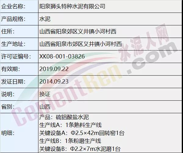 質(zhì)檢總局生產(chǎn)許可證辦公室數(shù)據(jù)顯示陽(yáng)泉獅頭特種水泥有限公司主要以生產(chǎn)鋁酸鹽水泥系列為主,為窯磨一體全能企業(yè),熟料生產(chǎn)線關(guān)鍵設(shè)備為Φ2.5×42m回轉(zhuǎn)窯1臺(tái);水泥粉磨生產(chǎn)線關(guān)鍵設(shè)備為Φ2.2×7m水泥磨1臺(tái)。
