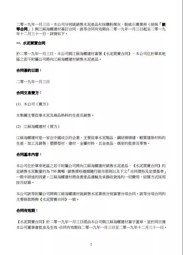 水泥人網(wǎng)通訊員消息:2019年1月3日,海螺水泥(00914.HK)公布,公司與江蘇海螺建材簽署《水泥買賣合同》,根據(jù)《水泥買賣合同》,公司位于華東地區(qū)的若干附屬公司,將向江蘇海螺建材銷售水泥產(chǎn)品,合同有效期自2019年1月3日至2019年12月31日,預(yù)估總交易金額約為不多于人民幣25億元。