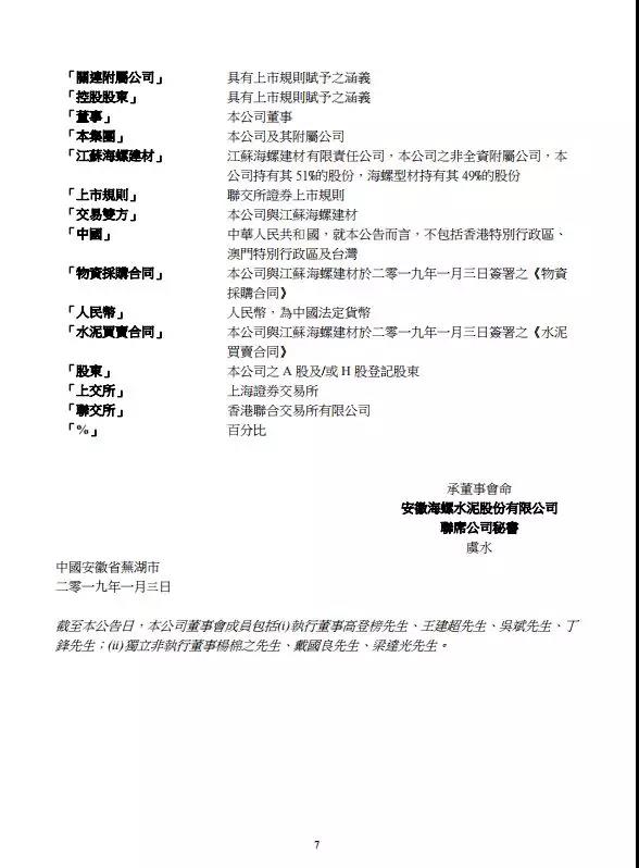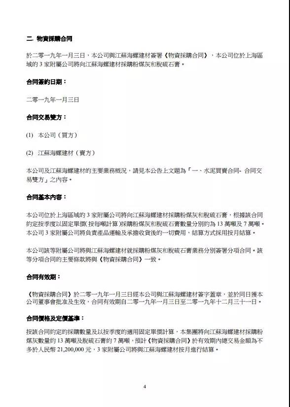 同日,公司與江蘇海螺建材簽署《物資采購(gòu)合同》,根據(jù)《物資采購(gòu)合同》,公司位于上海區(qū)域的3家附屬公司將向江蘇海螺建材采購(gòu)粉煤灰及脫硫石膏,合同有效期自2019年1月3日至2019年12月31日,預(yù)估總交易金額約為不多于人民幣2120萬(wàn)元。