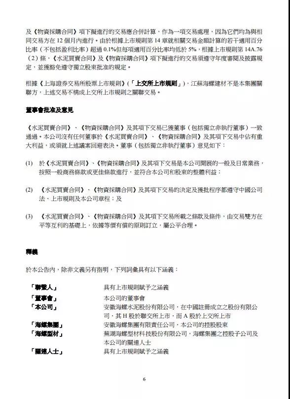 根據(jù)上市規(guī)則第14A.16條,江蘇海螺建材是公司關(guān)連附屬公司,并為公司關(guān)連人士。根據(jù)上市規(guī)則第14A章,《水泥買賣合同》及《物資采購(gòu)合同》項(xiàng)下的交易構(gòu)成公司持續(xù)關(guān)連交易。