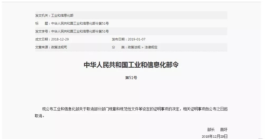 對于出臺本次《決定》的原因,工信部政策法規(guī)司解釋證明事項清理工作是黨中央、國務院減證便民、優(yōu)化服務的重要舉措。“根據《關于做好證明事項清理工作的通知》(國辦發(fā)〔2018〕47號)要求和司法部的統(tǒng)一部署,工業(yè)和信息化部組織開展了證明事項清理相關工作,全面摸底梳理,深入研究論證,形成了《決定》。”