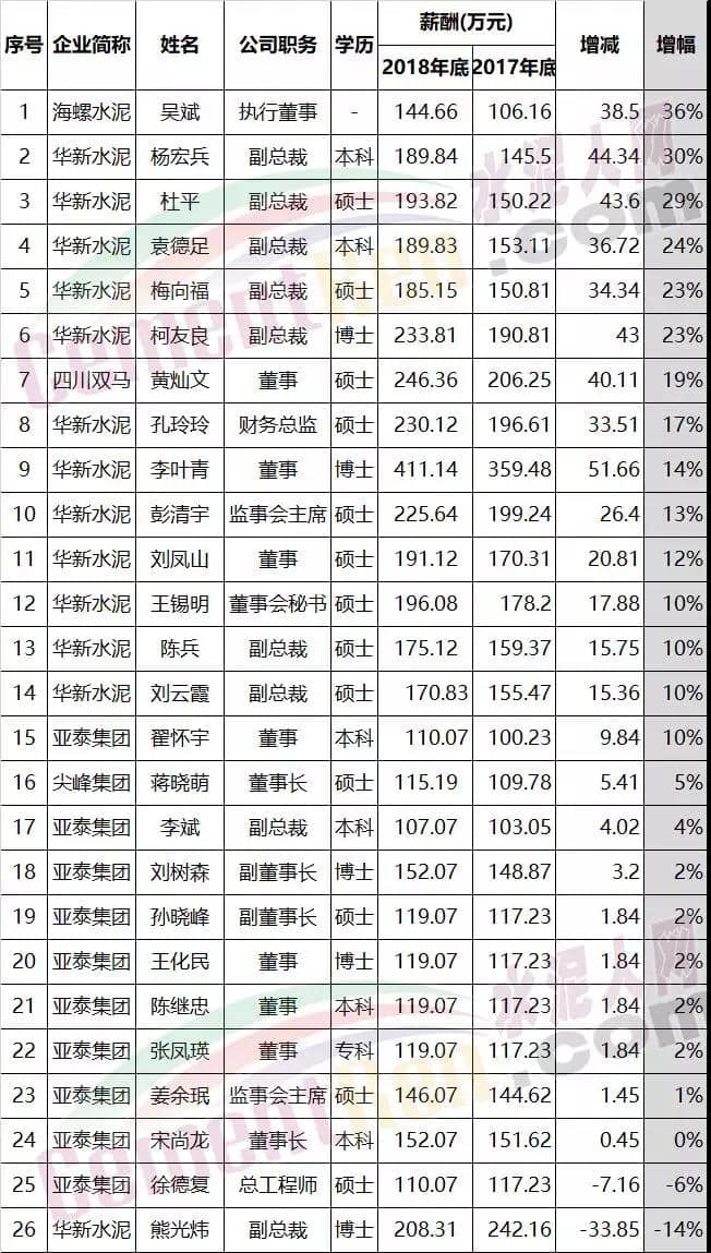 各大水泥集團高管薪酬曝光!2019年收入將大增!