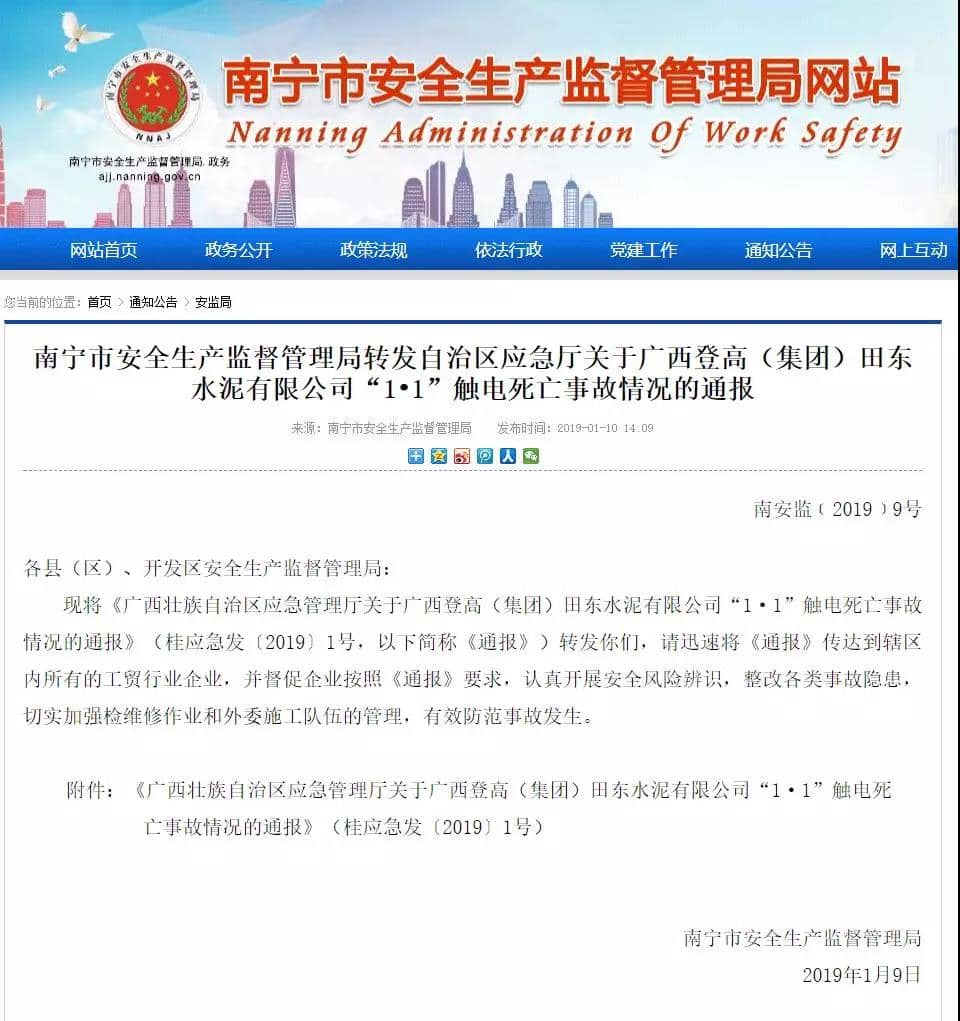 附:廣西壯族自治區(qū)應(yīng)急管理廳關(guān)于廣西登高(集團)田東水泥有限公司“1_1”觸電死亡事故情況的通報