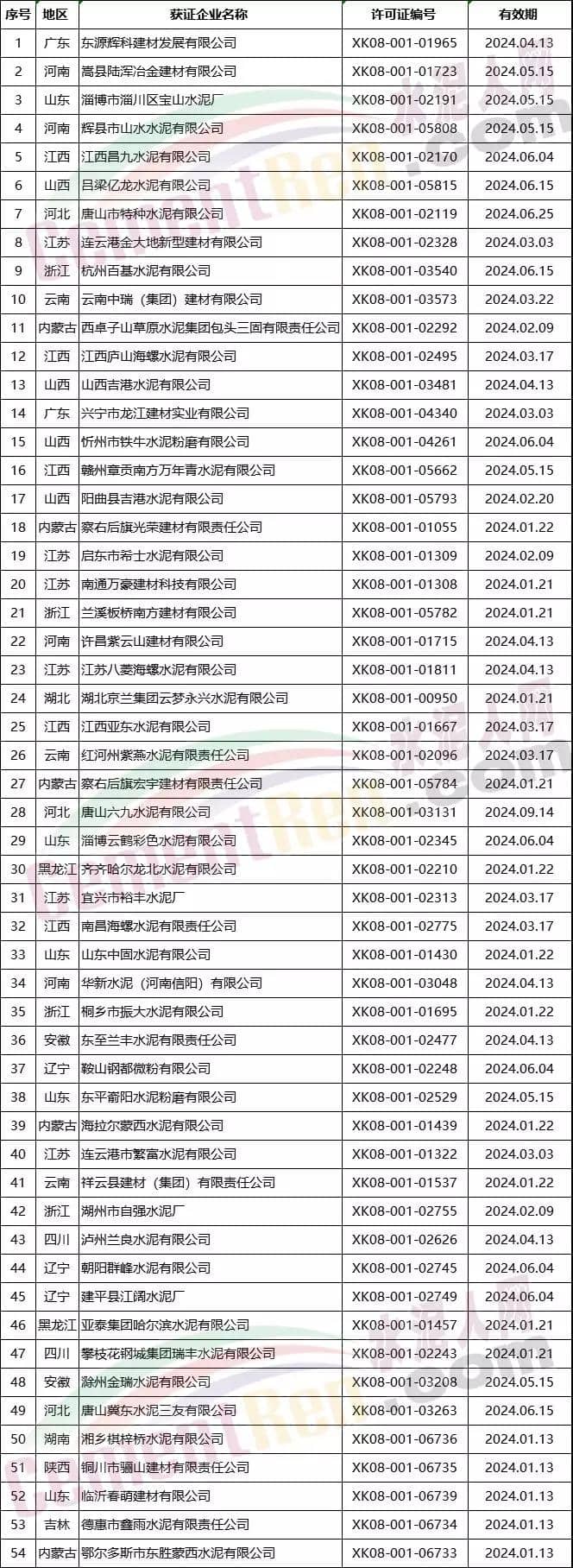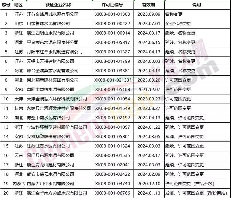 本期發(fā)放的水泥企業(yè)生產(chǎn)許可證涉及海螺水泥、南方水泥、金隅冀東、山水水泥、蒙西水泥、萬年青水泥、亞泰水泥、亞東水泥、上峰水泥等企業(yè)及其子公司。其中九江上峰水泥有限公司為新發(fā)證書。