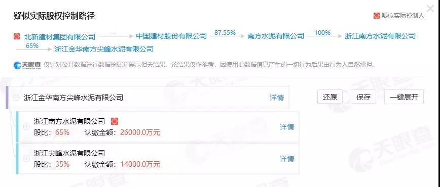 天眼查數(shù)據(jù)顯示,浙江金華南方尖峰水泥有限公司為浙江南方水泥有限公司和浙江尖峰水泥有限公司合資公司。其中中國建材股份有限公司旗下浙江南方水泥有限公司股比65%為第一大股東,浙江尖峰水泥有限公司股比35%