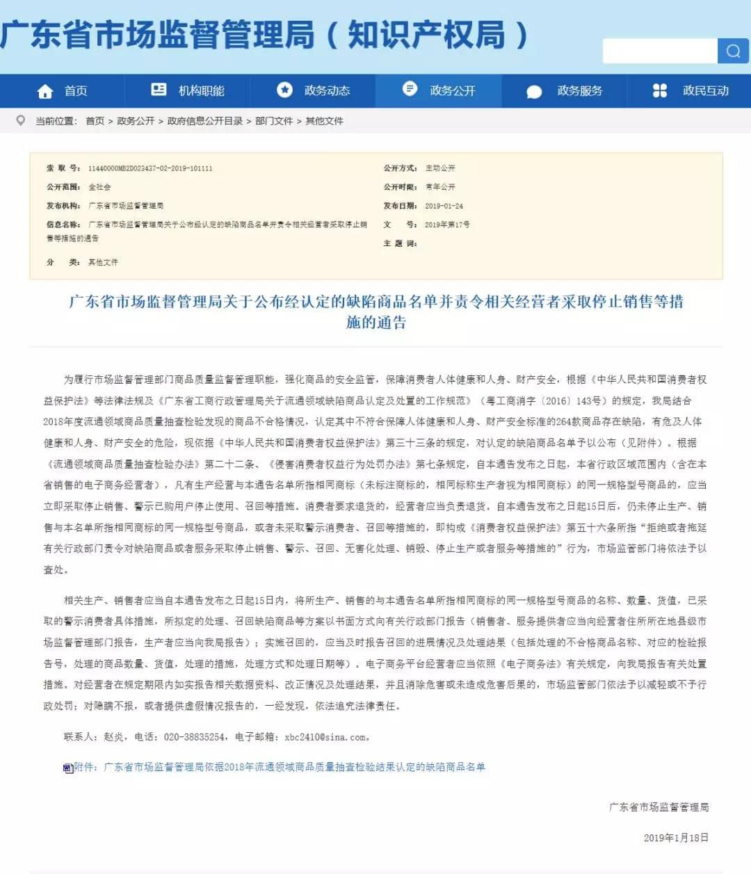 近日,廣東省市場(chǎng)監(jiān)督管理局官網(wǎng)發(fā)布《廣東省市場(chǎng)監(jiān)督管理局關(guān)于公布經(jīng)認(rèn)定的缺陷商品名單并責(zé)令相關(guān)經(jīng)營(yíng)者采取停止銷(xiāo)售等措施的通告》稱(chēng):為履行市場(chǎng)監(jiān)督管理部門(mén)商品質(zhì)量監(jiān)督管理職能,強(qiáng)化商品的安全監(jiān)管,保障消費(fèi)者人體健康和人身、財(cái)產(chǎn)安全,根據(jù)《中華人民共和國(guó)消費(fèi)者權(quán)益保護(hù)法》等法律法規(guī)及《廣東省工商行政管理局關(guān)于流通領(lǐng)域缺陷商品認(rèn)定及處置的工作規(guī)范》(粵工商消字〔2016〕143號(hào))的規(guī)定,廣東省市場(chǎng)監(jiān)督管理局結(jié)合2018年度流通領(lǐng)域商品質(zhì)量抽查檢驗(yàn)發(fā)現(xiàn)的商品不合格情況,認(rèn)定其中不符合保障人體健康和人身、財(cái)產(chǎn)安全標(biāo)準(zhǔn)的264款商品存在缺陷,有危及人體健康和人身、財(cái)產(chǎn)安全的危險(xiǎn),并依據(jù)《中華人民共和國(guó)消費(fèi)者權(quán)益保護(hù)法》第三十三條的規(guī)定,對(duì)認(rèn)定的缺陷商品名單予以公布。通告全文如下: