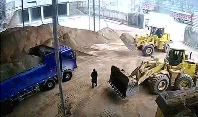 這是河北省某地的一家混凝土攪拌站的物料堆場,視頻里一位工作人員在鏟車邊上來回走動,鏟車司機可能沒注意到有人在鏟斗前面,便誤將工作人員鏟進了料斗,隨即到料堆取料,連人帶料一起投入了喂料倉。小編注意到這名工作人員被鏟進喂料倉后,鏟車鏟斗拍了幾下,隨后這名工作人員還掙扎著動了一下。