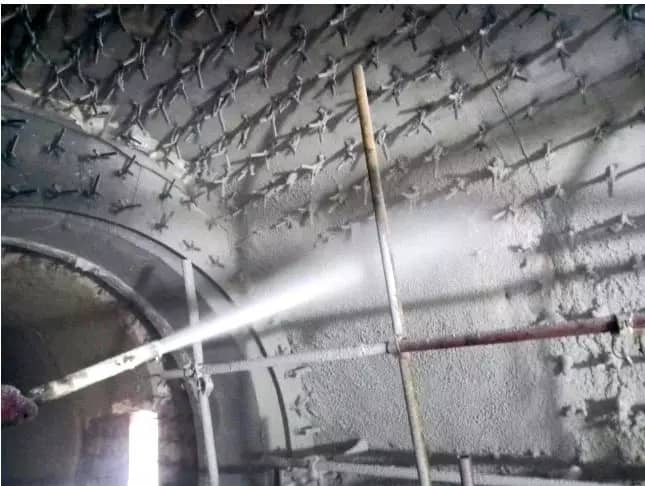 4、性能優(yōu)異:因噴射施工保證材質(zhì)分布均勻、無(wú)峰窩、空洞現(xiàn)象,與設(shè)備殼體結(jié)合緊密,在比傳統(tǒng)澆注料強(qiáng)度大幅降低的情況下使用壽命基本一致。