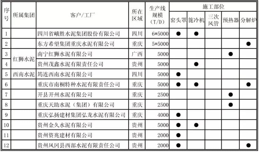 渝新嘉南:2019年3月,重慶良友在渝新嘉南水泥2500T/d水泥生產(chǎn)線窯頭罩直墻進(jìn)行噴涂施工,用噴涂料替代傳統(tǒng)澆注料,極大的提高了施工效率。
