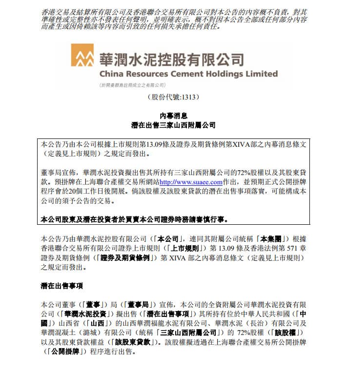 華潤(rùn)水泥控股(01313)公布,就潛在出售3家山西附屬公司,2019年1月25日已完成征集意向受讓方的階段,根據(jù)上海聯(lián)合產(chǎn)權(quán)交易所出具的受讓資格反饋函,經(jīng)審慎考慮意向受讓方基本情況后,該公司認(rèn)為繼續(xù)公開掛牌將無法實(shí)現(xiàn)聯(lián)合出售3家山西附屬公司的商業(yè)目標(biāo),因此,華潤(rùn)水泥投資已于公告日期正式通知上海聯(lián)合產(chǎn)權(quán)交易所撤銷本次公開掛牌。