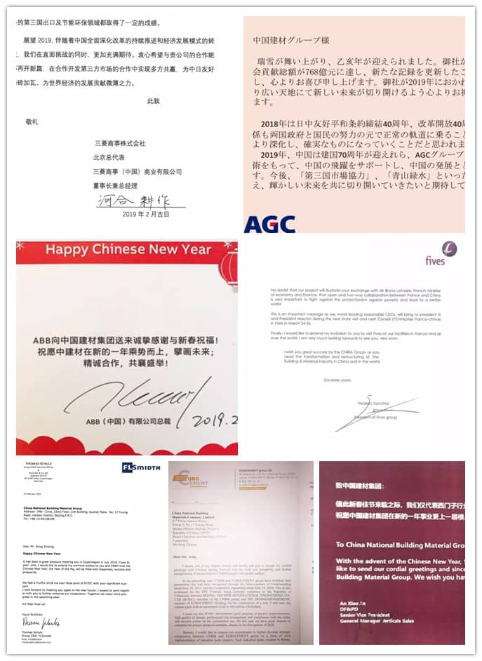 中國建材集團(tuán)海外合作伙伴寄語集團(tuán)2019年發(fā)展,其中既有擁有幾十年合作歷史的老朋友,也有在2018年結(jié)識的新朋友;既有基石業(yè)務(wù)持續(xù)推進(jìn)中的支持者,也有三新產(chǎn)業(yè)開拓征途上的同行者。寄語中包含了對以往合作業(yè)績上的總結(jié)和感恩,也有對未來深入合作的思考和期待。