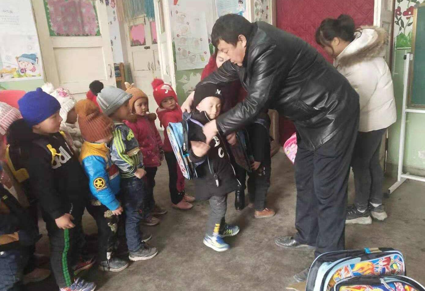 開學(xué)第一天,喀什蔬附縣烏帕爾鎮(zhèn)十二村幼兒園小二班里,歡聲笑語,熱鬧非凡,新疆天業(yè)集團水泥產(chǎn)業(yè)支教老師吳志強,正在給小二班的全體小朋友贈送書包。