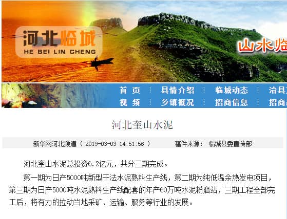 日前,河北臨城縣委宣傳部發(fā)布消息稱,河北奎山水泥總投資6.2億元,共分三期完成。