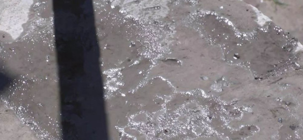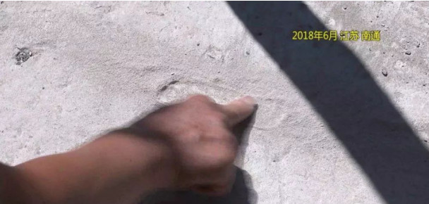 在現(xiàn)場,尹先生用手指在水泥地面上左右擦動,擦動的地方不僅會凹進去,還有小顆粒產(chǎn)生,而澆上水后,水泥地面上冒起了小泡泡。