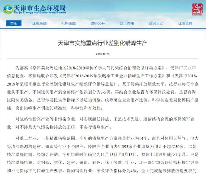 《天津市重點行業(yè)采暖季差異化錯峰生產(chǎn)績效評價指導(dǎo)意見》要求,方案要求,在2018-2019年采暖季期間(2018年11月15日至2019年3月15日)。