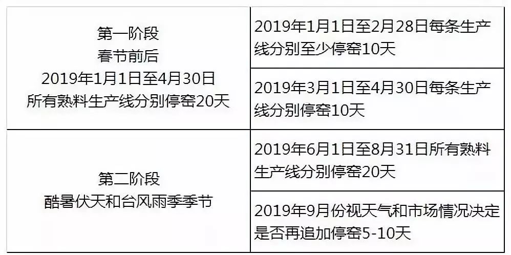 要求河南省通用水泥熟料企業(yè)行業(yè)自律,有效壓減水泥行業(yè)產(chǎn)能過剩。自2019年3月1日起實施,具體安排如下:3月份停窯;4~5月份正常生產(chǎn);6月份停窯;7~10月份正常生產(chǎn);11月、12月份停窯;2020年1~2月份正常生產(chǎn)。