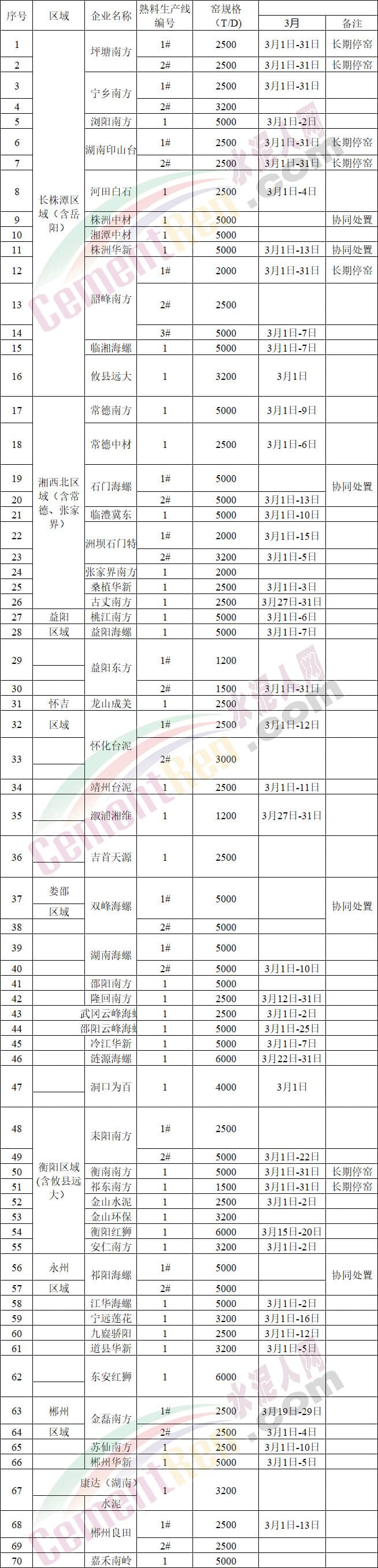 湖南省經(jīng)信委、省環(huán)保廳下達了湖南省大氣污染防治特護期(第四季度)水泥企業(yè)錯峰生產(chǎn)計劃的通知,文件中可以數(shù)出水泥企業(yè)共55家,熟料生產(chǎn)線共70條,其中5條生產(chǎn)線不參與錯峰。