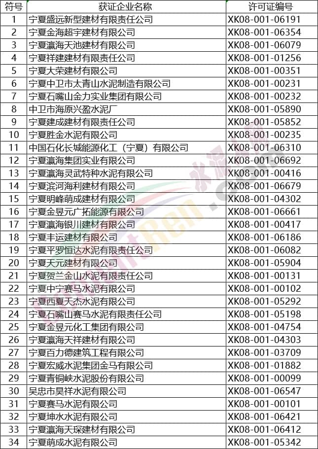 寧夏自治區(qū)部分水泥企業(yè)名單