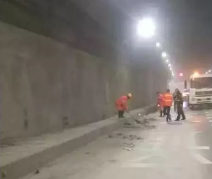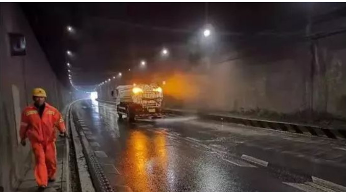 因?yàn)樗嗍欠蹓m類物質(zhì),加上隧道空間狹窄,極不好清理。繞城高速西南段分公司立即組織養(yǎng)護(hù)人員20余人進(jìn)行人工作業(yè),清掃作業(yè)車、灑水車、水炮降塵車等九個(gè)來回進(jìn)行沖洗、降塵;