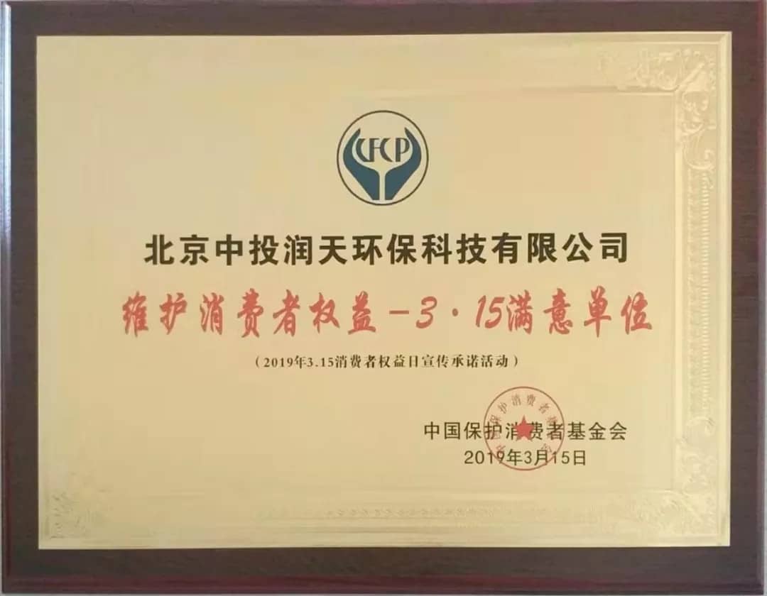 北京中投潤天環(huán)保榮獲3.15維護消費者權(quán)益滿意單位