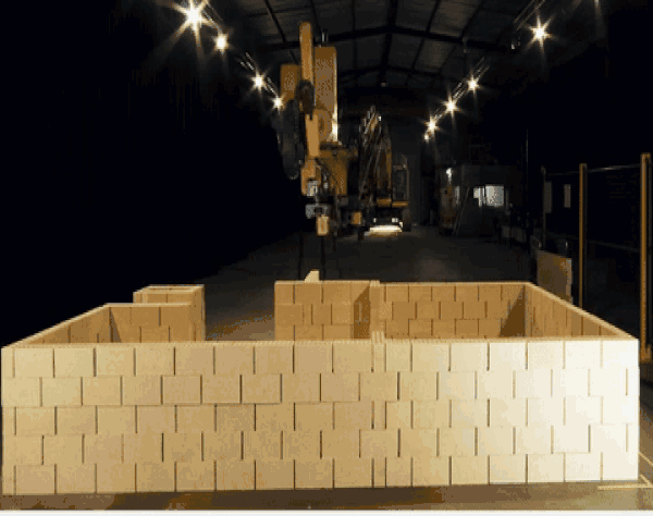 它的工作原理是:利用3D計算機,輔助設計房屋的形狀結構。機器人隨后可計算每塊磚的位置,磚塊置于傳送帶上,沿著機器人伸縮臂運送。傳至末端,一個爪樣的機械手握住磚塊。