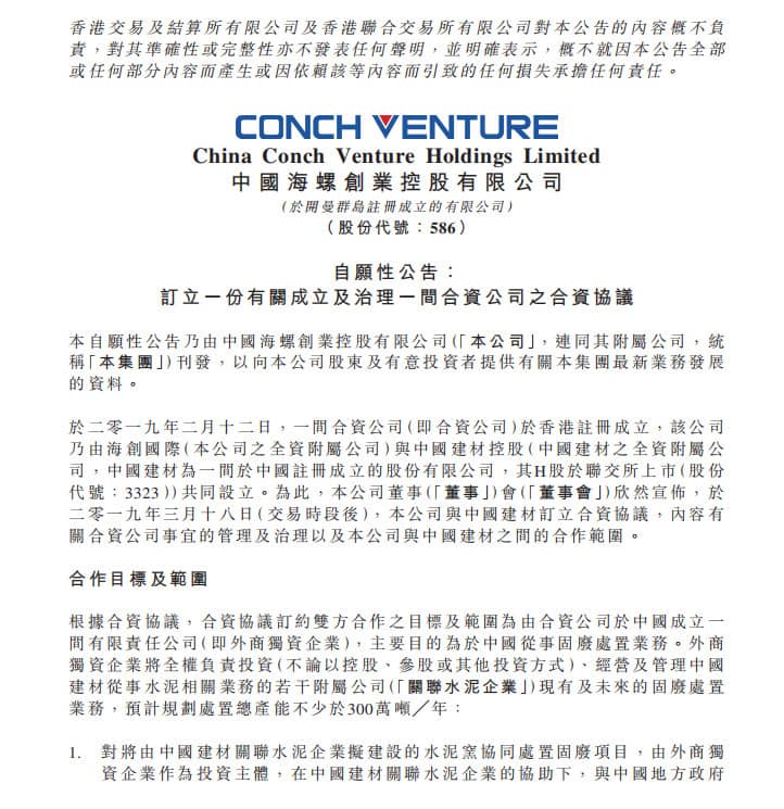 海螺創(chuàng)業(yè)(0586.HK)2019年3月18日晚公告,公司與中國建材設(shè)立合資企業(yè),利用中建材水泥窯資源經(jīng)營水泥窯危廢固廢處置,公司與中建材各持股50%,未來由公司并表。此舉將促使公司獨占中建材優(yōu)質(zhì)水泥窯資源,產(chǎn)能空間至少翻倍達到600萬噸/年以上并保證高利率水平運行。