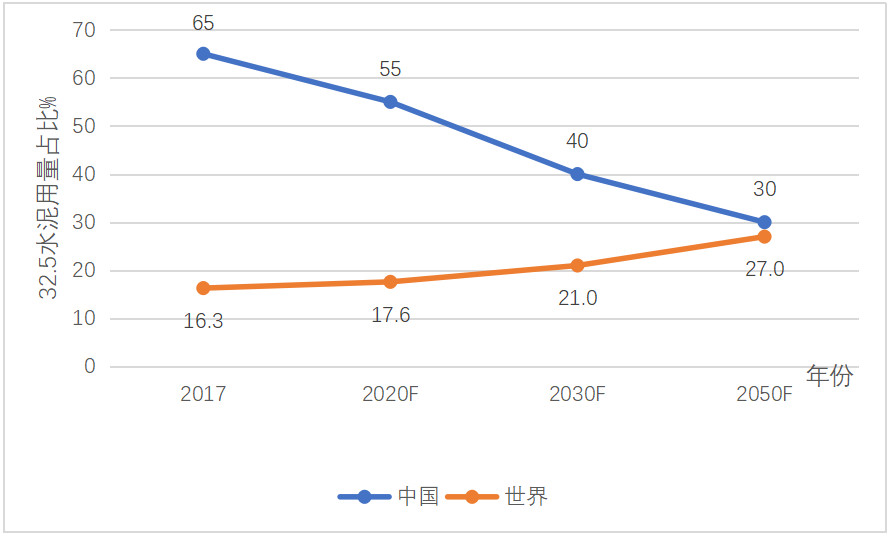 2030年和2050年,世界32.5水泥用量占比分別為21%和27%,2050年比2017年上升10.7個百分點;中國則分別為40%和30%,相應(yīng)的下降35個百分點。這是中國逐步向國際先進看齊的結(jié)果。