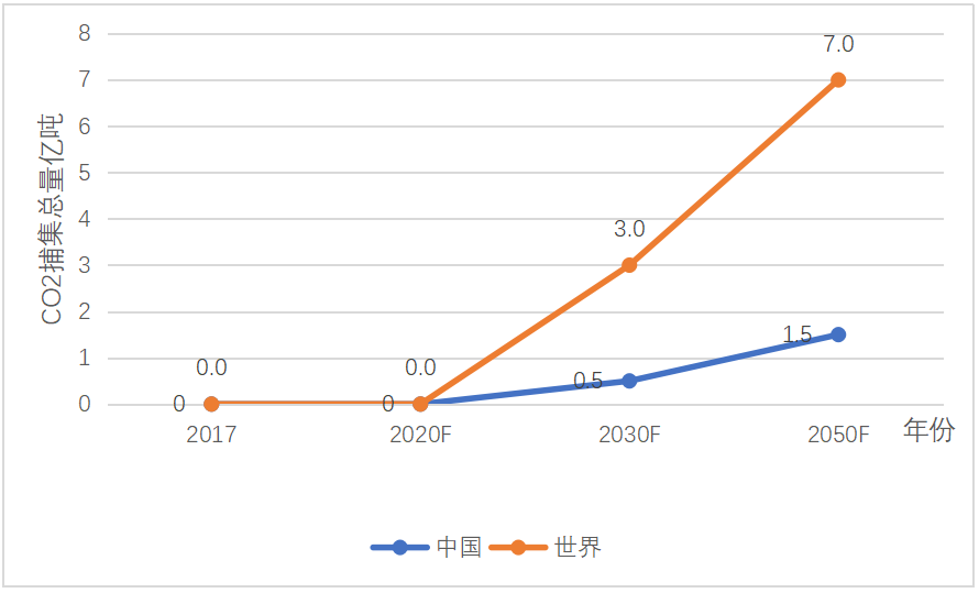 2030年和2050年,世界水泥工業(yè)二氧化碳捕集總量分別為3噸和7噸,中國則分別為0.5噸和1.5噸。兩者都是臨近2030年才開始規(guī)?;虡I(yè)化運行的,但中國發(fā)展較快,應(yīng)用較廣。