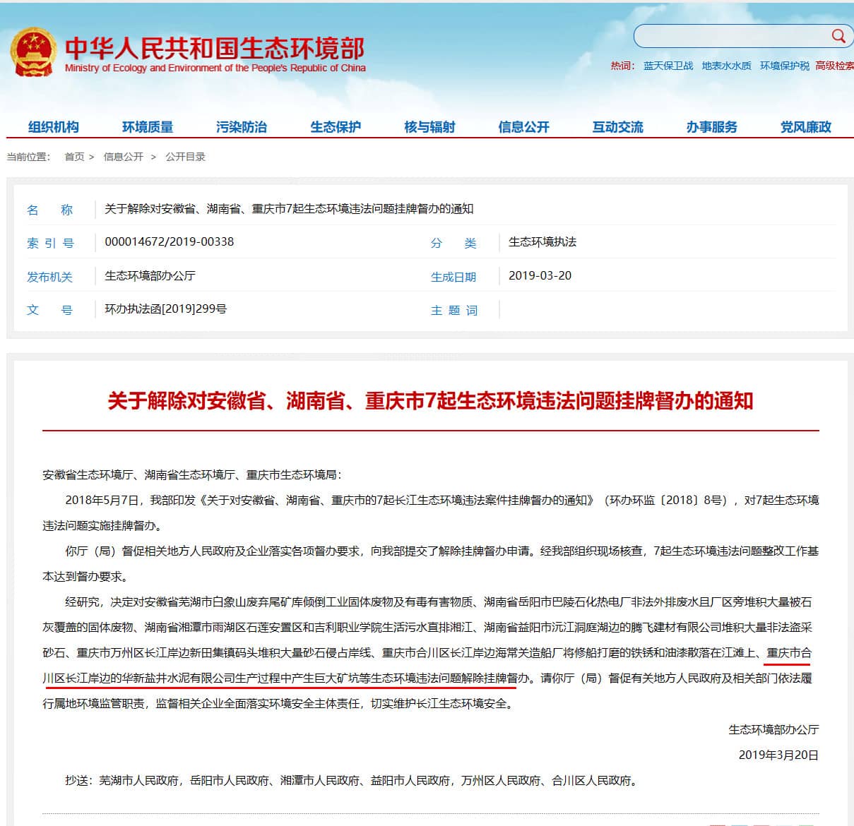 生態(tài)環(huán)境部近日印發(fā)通知,解除對安徽省、湖南省、重慶市7起生態(tài)環(huán)境違法問題掛牌督辦。