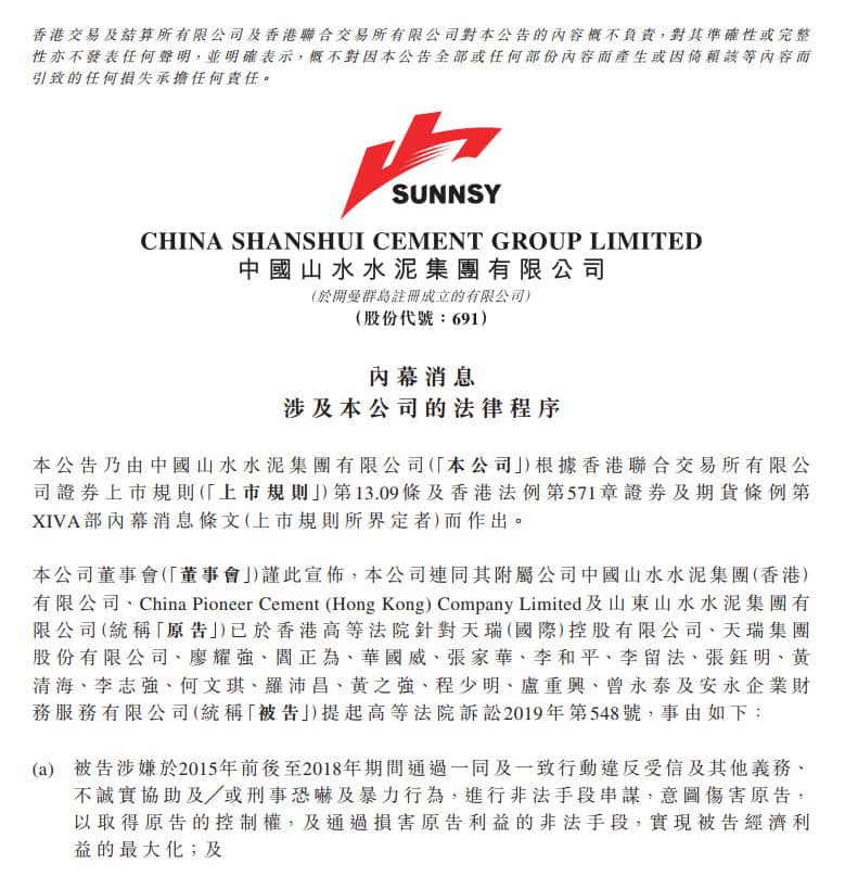山水水泥(00691)公布,該公司連同其附屬公司中國山水水泥集團(tuán)(香港)有限公司、China Pioneer Cement(Hong Kong)Company Limited及山東山水水泥集團(tuán)有限公司(統(tǒng)稱原告)已于香港高等法院針對天瑞(國際)控股有限公司、天瑞集團(tuán)股份有限公司、廖耀強(qiáng)、閻正為、華國威、張家華、李和平、李留法、張鈺明、黃清海、李志強(qiáng)、何文琪、羅沛昌、黃之強(qiáng)、程少明、盧重興、曾永泰及安永企業(yè)財(cái)務(wù)服務(wù)有限公司(統(tǒng)稱被告)提起高等法院訴訟2019年第548號。