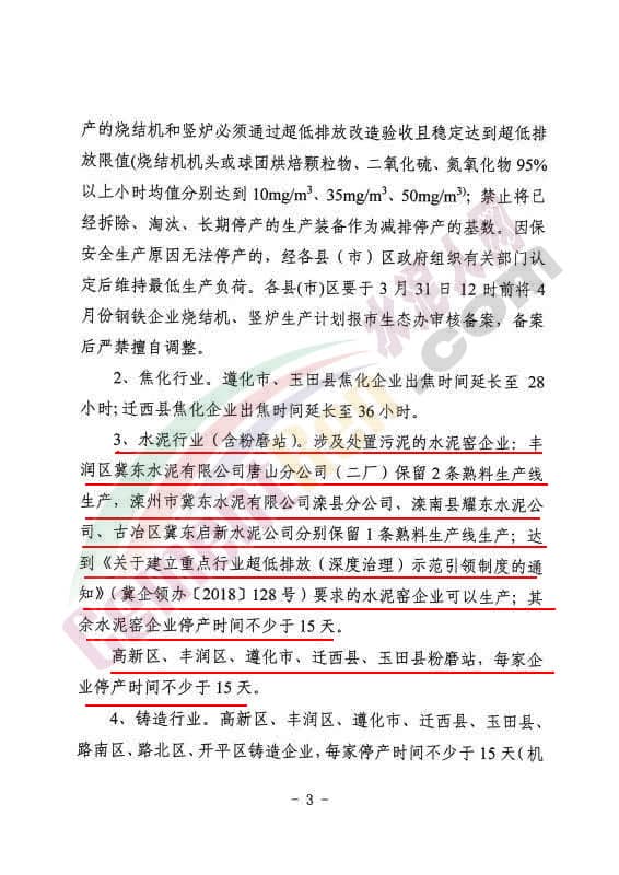 ⑸高新區(qū)、豐潤(rùn)區(qū)、遵化市、遷西縣、玉田縣粉磨站,每家企業(yè)停產(chǎn)時(shí)間不少于15天。
